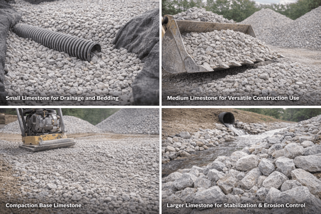 Why are different limestone sizes used in construction?